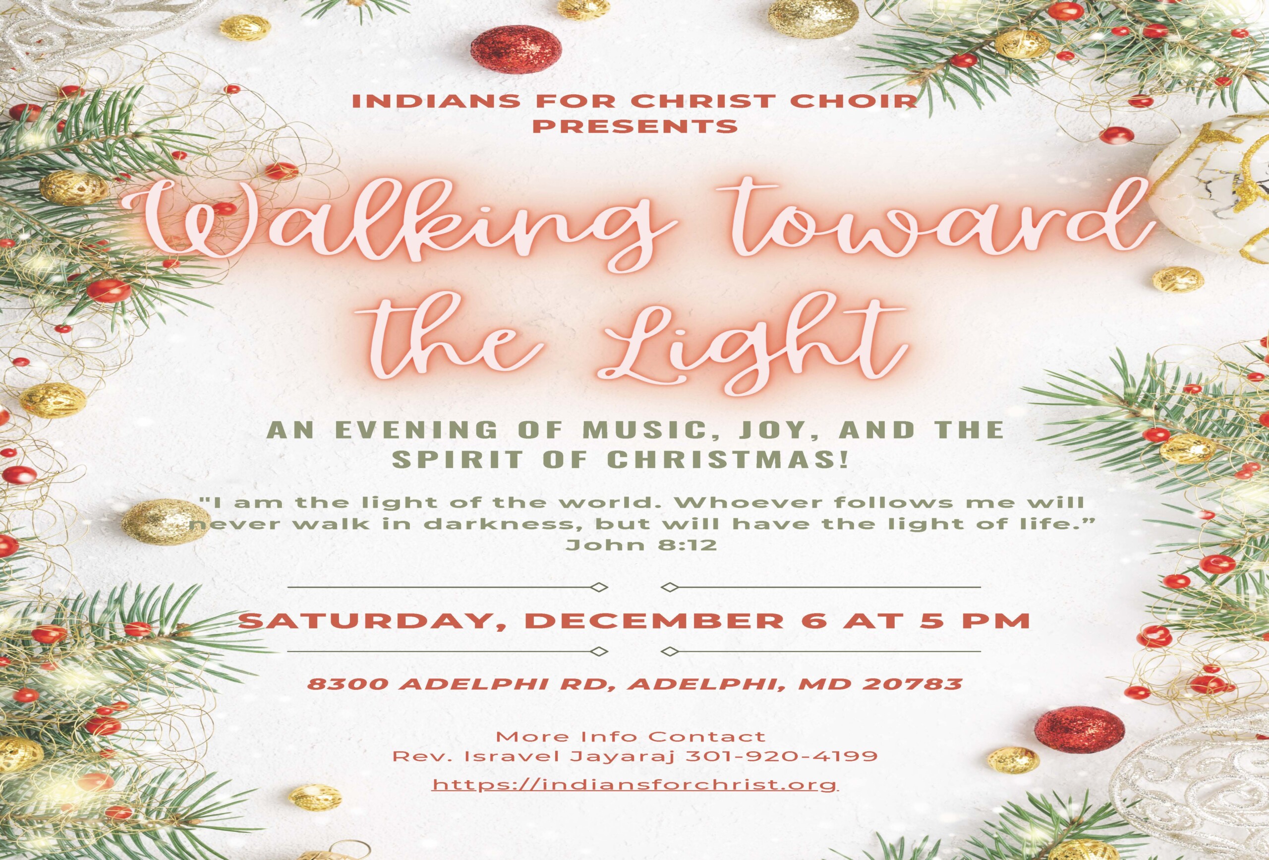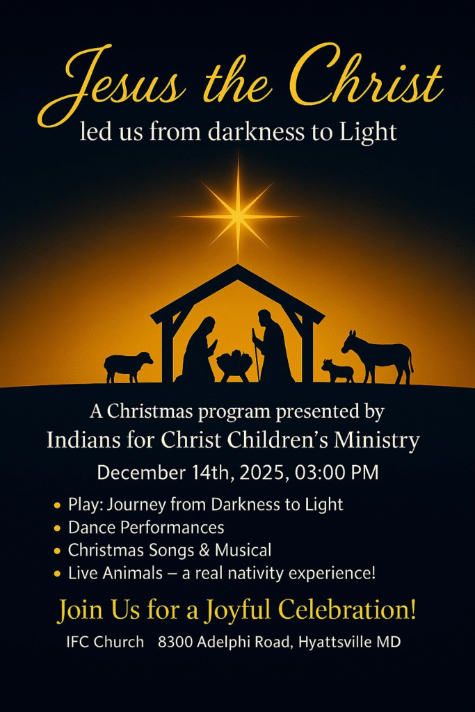 Mission – To proclaim, communicate the love and life-changing power of our Lord and Savior Jesus Christ to the South Asian Community in the Washington DC metropolitan area. We desire to equip believers through discipleship, enabling them to evangelize to the nations of the world, support missionaries, help them be a part of God’s family and magnify His name.