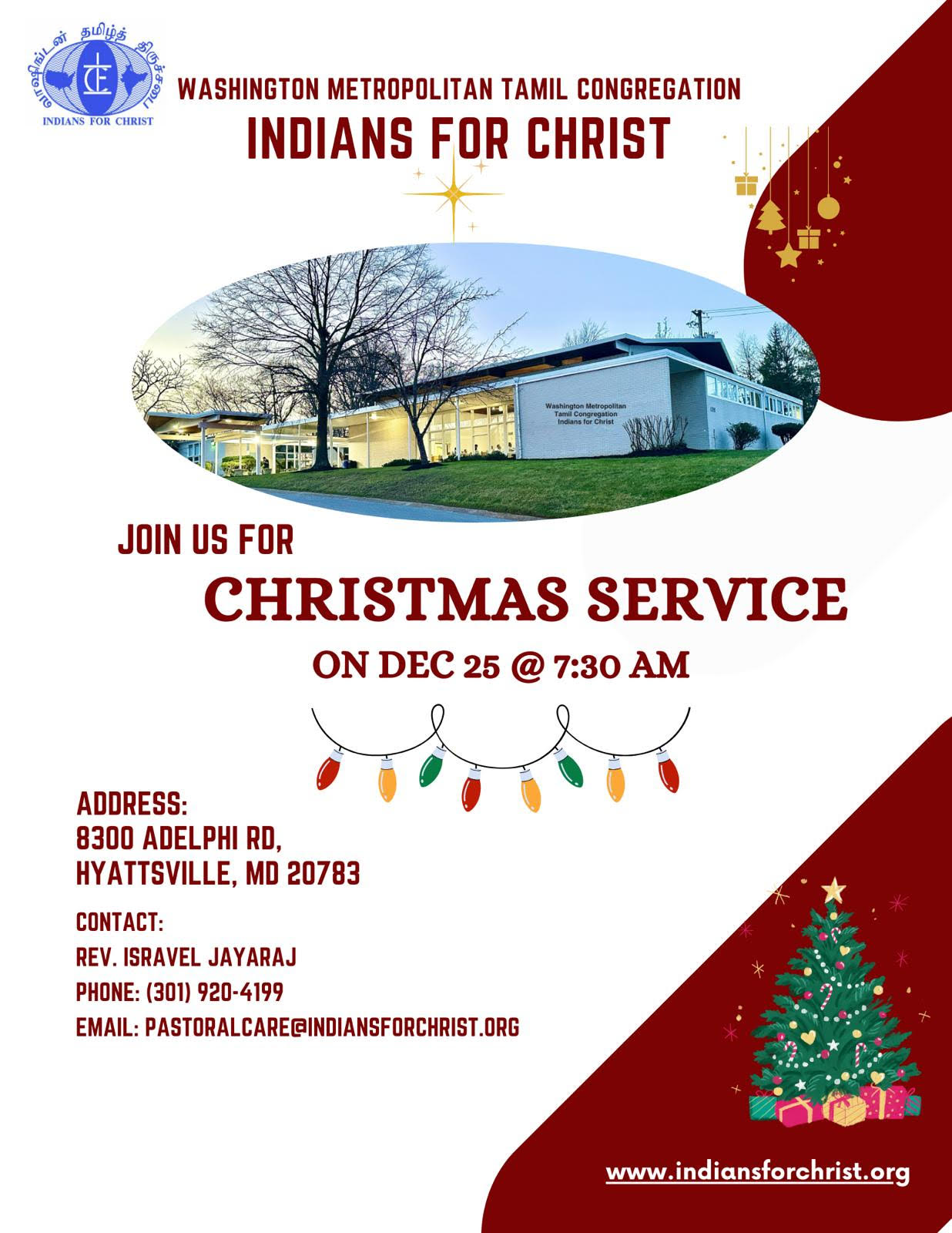 Rev. Isravel Jayaraj has been serving as the Pastor of Indians For Christ, Washington Metropolitan Tamil Congregation since March, 2014. Born and raised in Chennai, India, Rev. Isravel has a passion to serve Lord Almighty and after accepting Jesus Christ as his personal savior at a very young age, he committed himself for this very purpose of serving God and work toward the extension of His Kingdom. It is noteworthy to mention that his parents Mrs. Sagunthala Jayaraj and Late Mr. Jacob N. Jayaraj (Lay Preacher) were instrumental in instilling christian values and thirst for mission work. Rev. Isravel embraces biblical values and his simple and theologically meaningful sermons & devotions are very practical in today’s life.